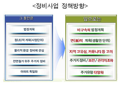 오세훈 서울시장은 "개발과 성장의 시대를 거치며 '전면철거와 아파트 건설'로 고착화된 재개발·재건축 개념을 각 지역의 특성을 존중하는 '보존과 개발이 양립'하는 선진도시형으로 전환할 것"이라고 말했다. 서울시는 배포한 자료에서 "개발과 성장 시대에 다소 소홀했던 서민주택 감소에 따른 저소득층 주거안정 저해 문제와 지역 고유성 훼손 및 공동체 와해 등의 인문사회적 측면도 도시주거안정을 위한 해결과제로 남아 있다"고 덧붙였다.