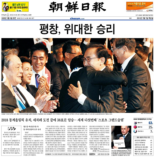 주요 언론은 일제히 1면 톱으로 이명박 대통령 일가, 이건희 삼성전자 회장 등이 평창의 유치 확정 소식을 듣고 기뻐하는 모습이 담긴 사진을 실었다.