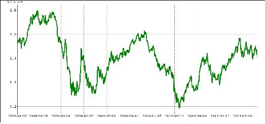 아래 그림은 2008년부터 최근까지 달러 대비 유로화 가치의 추이를 나타내는 그래프다. 이를 살펴보면 유로화의 변화 추이는 달러화와 정반대로 움직였음을 알 수 있다. 이를테면 2008년 9월부터 달러화 거품이 만들어지는 동안 유로화 가치는 떨어졌고, 2009년 4월부터 달러화가 제자리를 찾아가며 떨어질 때 반대로 유로화 가치는 고공행진을 이어갔다.