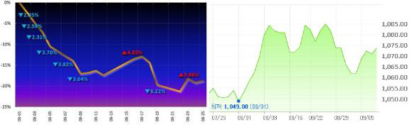 8월 1일부터 9일까지 코스피지수는 무려 15% 이상 곤두박질쳤는데, 원-달러 환율은 정반대로 이 기간 동안 수직으로 상승했다. 8월 13일부터 17일까지 코스피지수가 반등했는데, 마찬가지로 원-달러 환율은 이 기간 동안 수직으로 떨어짐을 알 수 있다. 8월 23일 코스피가 깜짝 반등할 때에도 원-달러 환율은 밑으로 떨어졌다. 다시 말해 코스피 지수와 원-달러 환율은 정반대로 움직인다는 것이다.