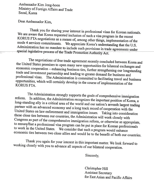 민주사회를 위한 변호사모임(민변)이 강조했던 미국 전문직 비자 쿼터 관련 외교서한이 실제 존재했던 것으로 확인됐다.