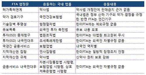 범국본 정책자문위가 지적한 내용들을 보면, 공공보건에 큰 영향을 줄 것으로 보이는 '허가-특허연계조항'을 비롯해 '투자자-국가제소제(ISD)', 금융관련 규정, 지적재산권 관련 규정 등이 현행 국내법과 충돌한다. 범국본 정책자문위가 제시한 충돌규정들을 요약 정리했다.