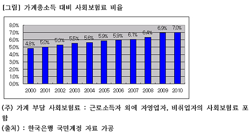 가계 소득에서 사회보험료가 차지하는 비중도 한국은행 국민계정 자료를 토대로 계산이 가능하다. 그것은 2000년 4.8%에서 2010년 7.0%로 2.2% 포인트 상승했다.