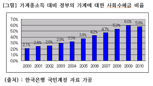 가계소득 대비 사회수혜금 비율도 해마다 높아지고 있는 것으로 나타난다. 그것은 2000년에는 2.1%에 그쳤으나 2010년에는 5.8%에 이르고 있다.