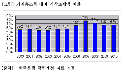 한국은행 국민계정 자료를 토대로 계산해 보면 가계 소득에서 경상조세가 차지하는 비중은 2000년 5.5%에서 2007년 7.7%까지 상승했다가, 그 이후 다시 하락해 2010년 6.8%에 머물러 있다. 10년간 1.3%포인트 상승한 셈이다.