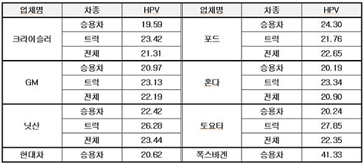 다시말해 같은 업체라 할지라도 공장별로, 생산라인별로, 차종별로 각각의 HPV를 측정한다는 것이다. 기본적으로 승용차(car)와 트럭(truck) 부문을 구분해서 계산하며, 승용차도 소형차와 중/대형차 및 SUV를 구분한다. 심지어 같은 SUV 종류라 하더라도 대형과 중형, 컴팩트형(CUV)을 모두 구분해서 수치를 산출한다.