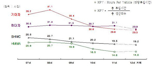 위 표는 현대자동차 노사기획팀이 발간하는 "현자 iN"이라는 신문(2012.2.16.)에 실린 그래프이다. 여전히 HPV 수치를 놓고 현대차의 해외공장들(BHMC : 현대차 중국공장, HMMA : 현대차 앨라배마공장)과 비교를 하는 어리석은 짓을 반복하고 있다.