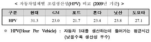 포드를 제외하면 예외없이 모든 메이커들에서 트럭의 HPV가 승용차의 HPV보다 2~7시간가량 높게 나타나는 것을 알 수 있다. 만일 생산되는 차종이 무엇인지를 전혀 구분하지 않고 전체 HPV 수치만 놓고 본다면 현대차 앨라배마 공장의 생산성이 가장 높아 보인다. 하지만 앨라배마 공장은 승용차만을 생산하기 때문에 승용차 부문만 따로 떼어놓고 비교하면 크라이슬러, 혼다, 도요타에 비해 생산성이 낮게 나타난다.