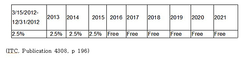 가령 한국산 자동차를 예를 들어 보자. 미 무역위원회 공고를 보면 다음과 같이 2021년까지의 한국산 승용차의 관세율을 고시했다.