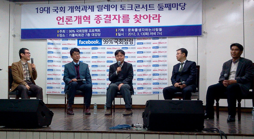청년유니온, 6월 민주포럼, 한미 FTA 폐기행동 등 각 시민단체가 오는 4.11 총선을 대비해 만든 프로젝트 그룹인 '99% 국회점령 프로젝트'가 주관한 이날 토크콘서트에는 노종면 YTN 전 노조위원장, 최승호 MBC PD, 최경영 KBS 기자, 조상운 국민일보·씨티에스 지부 노조위원장 등이 참여했다.