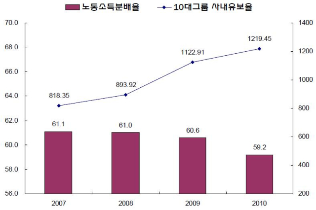 위 자료의 노동소득 분배율(단위 : %)은 한국은행이 발표한 수치이고, 10대그룹 사내유보율(단위 : %)은 매년 연말 기준으로 한국거래소와 상장사협의회가 발표한 수치를 바탕으로 그려본 그래프이다. 전체 국민소득에서 노동의 몫은 계속 줄어들고 있으며, 기업이 벌어들여 금고에 쌓아놓은 돈은 천정부지로 늘어나고 있음을 알 수 있다.
