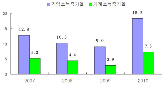 위 자료는 한국은행이 발표한 수치를 바탕으로 그린 그래프인데, 기업 소득은 해마다 두 자릿수 증가율을 보이는 반면, 가계 소득은 한 자릿수 증가율을 기록하는 등, 기업 소득 증가율이 가계 소득 증가율의 2~3배에 달하고 있음을 보여준다.