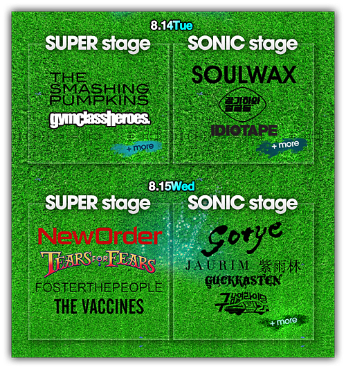 올해는 서울 시내 한 복판에서 새로운 페스티벌이 등장했다. 오는 8월 14일과 15일 이틀에 걸쳐 서울 올림픽공원에서 열리는 '슈퍼!소닉 2012'가 그것이다. 이 페스티벌은 스테이지를 관객이 골라 티켓을 지불하는 새로운 형태를 빼들었다. 네 개의 스테이지 중 원하는 스테이지만 골라 티켓을 구입하거나, 네 개의 스테이지를 모두 구입할 수 있다.