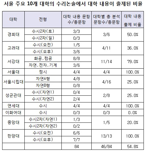 21일 사교육걱정없는세상이 서울의 10개 대학이 올해 낸 수리논술 문제를 분석한 결과, 분석대상 84개 문제 중 절반이 넘는 46문제(54.8%)가 고교 교과가 아닌 대학교과 수준의 지식을 요하는 문제였던 것으로 나타났다.