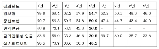 | ▲ 보험종류별 유지율. 출처: 보험연구원, <생명보험상품별 해지율 추정 및 예측모형>, 2010. 5. |