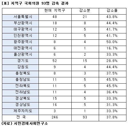 ⇨ 지역구 국회의원 수를 100명 정도 줄이려면 선거구 인구 상·하한선을 현재의 30만 명·10만 명 내외에서 60만 명·20만명 내외로 상향해야 합니다. 그 결과는 전체 지역구 국회의원 수가 현재의 246명에서 93명 줄어들어 153명이 되는 것으로 나옵니다. 감소율은 37.8%입니다.