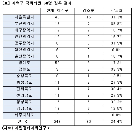 ⇨ 감소율이 30퍼센트가 넘은 지역은 16개 시도 중 6개로, 서울(31.3%), 부산(38.9%), 광주(37.5%), 강원(33.3%), 전북(36.4%), 경북(33.3%)이 이에 포함되었습니다. 반면 대전과 제주에는 큰 변화가 없었습니다. 제주 서귀포시는 인구가 13만 명으로 15만 명에 못 미치나, 지역적 특수성이 워낙 강해서 선거구를 존속시켰습니다. 다른 비수도권의 몇몇 지역도 이와 같은 원칙을 적용했습니다.