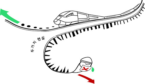 | ▲질주하는 철도 외주화에 밀려, 노동자들의 죽음의 선로도 질주한다. 우리도 이 열차에 올라탄지도 모른다. ⓒ정성희 |