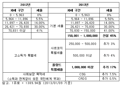 작년 12월 20일, 프랑스 의회는 2013년 예산안을 통과시켰다. 한국의 국회도 지난해 연말 세제 개편안을 포함하고 새 정부의 공약 예산안을 반영한 2013년도 예산안을 통과시켰다. 프랑스 예산안에 포함된 증세 방안과 우리나라의 증세 관련 논의를 비교해 보면, 다음과 같은 흥미로운 사실들이 발견된다.