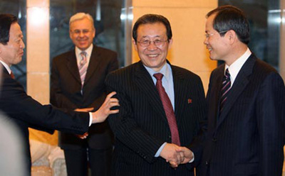 ▲ 13일 베이징의 댜오위타이에서 6자회담 폐막식 후에 열린 탕자쉬엔 중국 국무위원 접견에서 천영우 우리 측 수석대표와 김계관 북한 측 수석대표가 활짝 웃으며 악수를 하자 김하중 주중대사가 좀 더 가까이 서라며 북측 김 대표를 살짝 밀고 있다. ⓒ연합뉴스