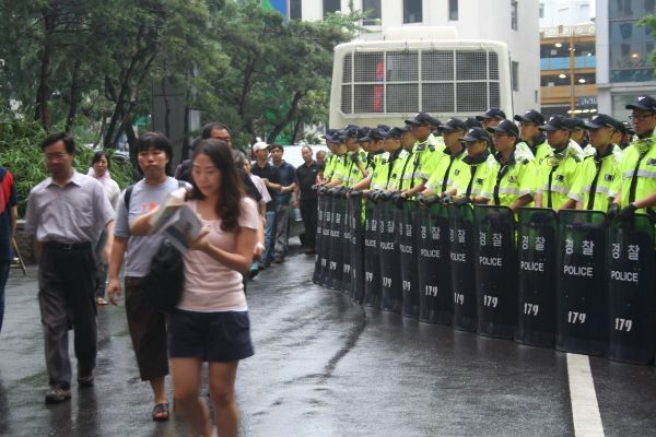12일 경찰의 강력한 원천 봉쇄와 쏟아지는 폭우 속에서 촛불 집회가 열렸다. 경찰은 이날 오후 2시부터 시청 앞 광장과 광화문 일대를 경찰 버스로 둘러싸 원천 봉쇄했고 시민은 국가인권위원회, 청계광장, 종각 등으로 흩어져 제각기 촛불 집회를 벌이는 중이다.
