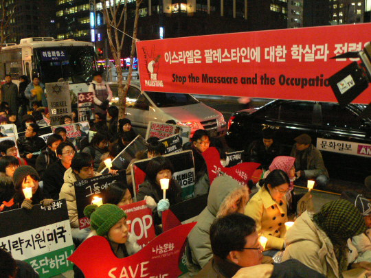 이날 촛불문화제에는 한국에서 그간 열린 팔레스타인 관련 집회·행사 중 최대인 200여 명의 시민들이 모여 이스라엘의 가자 공격을 비난했다. 참가자들은 '그들에게 땅을 그들에게 평화를, 새해를' '침략지원 미국은 학살을 중단하라' '이스라엘은 진짜 테러리스트' '가자 봉쇄를 중단하라' 등의 구호를 적은 각종 피켓과 선전물, 그리고 촛불을 들고 나왔다.