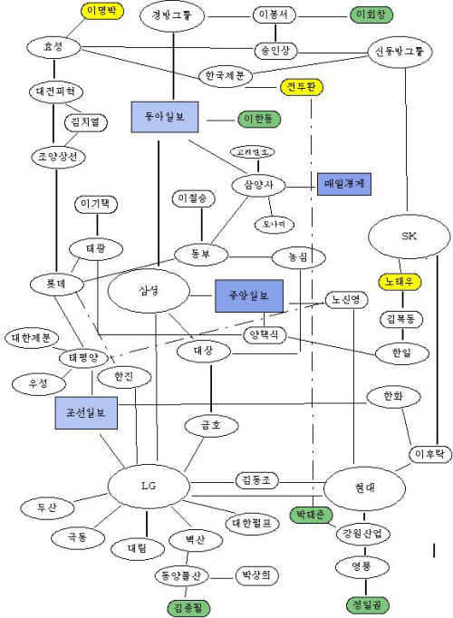 이제 재벌, 족벌신문 사주들과 (정치)권력자들의 얽히고 설킨 혼맥을 '부패와 공멸의 네트워크'라 부르는 이유를 알 만하지 않는가? 지상파 방송과 보도전문채널을 제외한 거의 모든 방송 영역을 이미 재벌 가족들의 회사가 소유, 지배하고 있고, 족벌신문들도 케이블방송(PP)에 진출해 있다. 마지막 남은 지상파 방송과 지상파 방송과 다름없는 종합편성채널마저 이래도 그들에게 갖다 바칠 것인가? 한나라당은 어느 나라 정당인가? 정말 '딴나라당' 소리를 듣고 싶은가?
