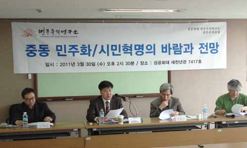 | ▲ 30일 서울 성공회대에서 열린 토론회 '중동 민주화/시민혁명의 바람과 전망'에서 유달승 한국외대교수(왼쪽 두번째)가 발제하고 있다. ⓒ성공회대 민주주의연구소 |