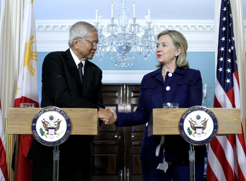 | ▲ 힐러리 클린턴 미국 국무장관이 23일(현지 시간) 미국 워싱턴 국무부에서 알베르트 델 로사리오 필리핀 외무장관과 만나 악수를 나누고 있다. ⓒAP=연합뉴스 |
