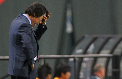 | ▲ 조광래 감독이 일본에게 0대3으로 뒤지고 있는 상황에서 머리가 아프다는 듯한 포즈를 취하고 있다. ⓒ연합뉴스 |