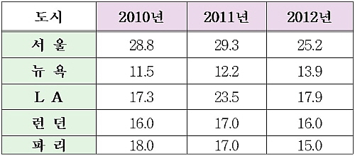 서울의 경우 미세먼지 연평균이 25.2로 우리 기준을 넘어섰고 뉴욕(13.9), 로스앤젤레스(17.9), 런던(16.0), 파리 (15.0) 등 세계 주요 대도시와 비교해볼 때도 최고 2배 가까이 오염된 것으로 드러났다. 광화학 스모그의 대명사로 악명을 떨친 로스앤젤레스보다 40퍼센트 가량 심하게 오염된 것이다.