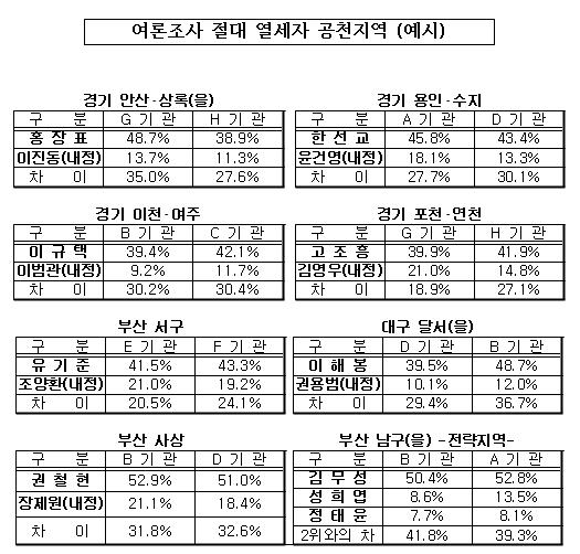김 의원은 또 ▲경기 안산.상록을 ▲경기 용인.수지 ▲경기 용인.처인 ▲경기 이천.여주 ▲경기 포천.연천 ▲경기 남양주을 ▲경기 안양동안갑 ▲부산 서구 ▲부산 남구 ▲부산 사상 ▲대구 달서을 ▲경북 안동 ▲경남 산청.함양.거창 등의 여론조사 결과를 제시하며 "지지율이 3배 이상 낮은데도 공천을 받고, 심지어 지지율 3~4위인 후보가 공천을 받는 것은 납득할 수 없다"고 주장했다.(표 참조)