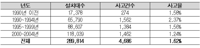 승강기는 또 어떤가? 최근 아파트 및 업무용 건물의 고층화 추세에 따라 승강기 없는 생활은 상상할 수 없다. 국내의 승강기 설치대수는 매년 약 3만 여 대 정도가 신규로 설치되고 있으며, 2005년 6월 말 현재 약 30만 대 이상이 설치됐다.