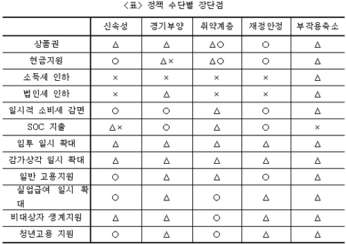 | ▲ 박 교수가 정책수단별 장단점 비교한 표. 이명박 정부가 이제까지 주력했던 소득세 인하, 법인세 인하, SOC 지출은 다른 정책 수단에 비해 단점이 많다는 것을 알 수 있다. ⓒ프레시안 |