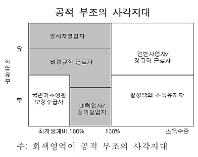 지금까지 제도의 한계야 그렇다 치더라도, 현 정부의 복지정책에서 이들에 대한 고민을 찾기도 쉽지 않다. 보고서는 "그동안 정부 정책은 최저생계보장 대상자 중심의 지원 제도에 주력했고 그 결과 차상위 및 차차상위 취약계층에 대한 지원이 미흡한 실정"이라고 지적했다.