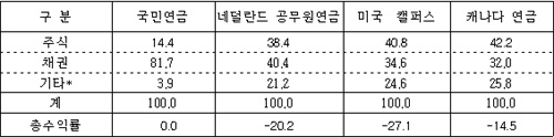 만약에 주식투자 비중이 지금보다 더 높았다면? 나는 작년에 채권 수익을 다 까먹고 막대한 적자를 기록했을 것이다. 주식투자 비중이 높은 외국 연기금처럼 말이다(<표> 참조). 전체 국민의 노후를 책임지는 보편연금인 나와 달리 이들의 대부분은 직종별로 조성된 소득비례연금이다. 그만큼 민간펀드를 흉내 내어 고위험 투자에도 나서는 놈들이다.