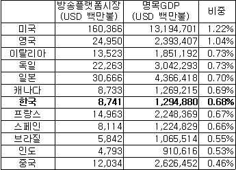 그러나 PWC의 유사한 자료를 정리한 KISDI는 우리나라의 GDP 대비 방송플랫폼시장 비율이 0.68%라고 주장하고 있었다.
