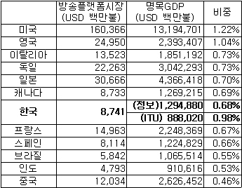 (주-2) 미국과 영국의 GDP 대비 방송시장 비율 수치가 큰 것은 영어권 종주국이라는 독특한 특성 때문에 방송수출시장이 넓기 때문임.