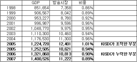 (주-3) 필자가 계산한 0.92%와 이 표의 0.98% 사이에 차이가 나는 이유는 필자와 KISDI의 방송시장 분류기준이 다르기 때문임.