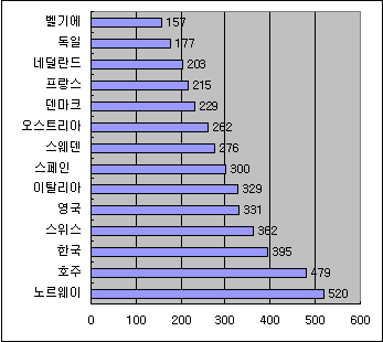 [그림] 주요국의 1일 1인당 급수량 (1998,12월 현재)
