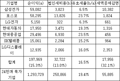 특히 법인세의 경우, 지난해 10대 재벌기업의 법인세 유효세율은 16.5%로, 흑자기업 전체의 법인세 유효세율 19.4%보다 낮았다. 삼성전자의 경우 법인세 유효세율은 6.5%에 불과했다.