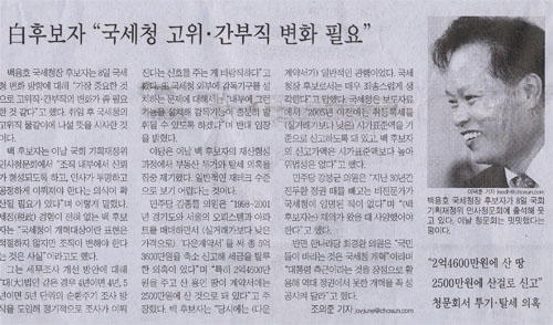 그럼에도 불구하고 <조선일보>, <동아일보>, <중앙일보>, <매일경제>, <한국경제>은 9일 전날 있었던 백 후보자의 인사청문회 기사를 6-8면에 배치하는 등 최대한 비중을 두지 않았다. 또 4대 권력기관장 중 한 명인 국세청장 인사청문회 기사를 모두 단신 처리했다.