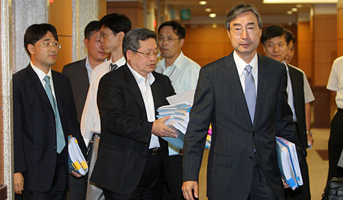 | ▲3일 오후 서울 여의도 금융감독원에서 황영기 KB지주 회장의 징계를 논의하기 위해 이장영 부원장(오른쪽) 등 위원들이 제재심의위원회 회의실로 들어가고 있다. ⓒ연합뉴스 |