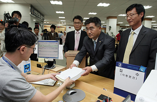 | ▲쌍용차 최상진(가운데) 기획재무본부장이 15일 채무변제 및 감자 계획 등을 담은 회생계획안을 서울중앙지법 파산부 민원실에 제출하고 있다. 왼쪽부터 정용원 경영지원실장, 최 본부장, 이상구 법무지원실장. ⓒ연합뉴스 |