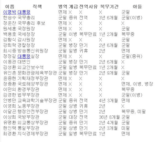 최근에 병역 비리가 대대적으로 적발된 것에 덧붙여서 정운찬 총리 후보가 병역을 면제받은 것이 큰 의혹의 대상으로 떠오르면서 '위장 전입'에 이어 '병역 기피'가 새삼 부유층과 권력층의 핵심적 특징으로 관심을 끌고 있다. 이 정권의 주요 인사들의 병역 상황에 대해 누군가 정리해서 인터넷에 공개한 다음의 자료는 정말 우리를 놀라게 한다. 어쩐지 부자, 위장전입, 병역 면제가 이 정권의 3대 특징이라고 해도 지나치지 않을 것 같은 생각마저 든다. 이렇듯 슬픈 대한민국의 문제는 정권의 핵심에서 무엇보다 명확히 확인된다.
