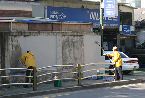 3일 오전 9시 30분. 대방동 주민센터 앞에 노란 잠바를 입은 사람들 예닐곱 명이 모였다. 이날 일거리로 인근 담장 도색을 배정받은 희망근로자들이다. 맞은 편 놀이터에서 익숙한 솜씨로 비질을 하던 최경환(가명, 66) 씨가 이동하는 그들의 뒷모습을 보며 혀를 끌끌 찼다. 그는 공공근로자다. 공공근로는 지난 외환위기 이후 김대중 정부가 신설한 제도며, 희망근로는 작년 경제위기 이후 이명박 정부가 만든 제도다. 둘 모두 정부가 주도한 일자리 사업으로 지역청소, 풀 뽑기, 농촌 일손 돕기, 재활용품 수리 등 하는 일이 같다.
