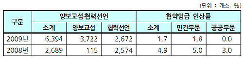 특히 공공부문은 지난 한해 한 푼도 임금이 오르지 못했다. 2008년의 공공부문 임금인상률은 3.0%였다. 민간 부문도 2008년 5.0%에서 지난해에는 1.8%로 떨어졌다.