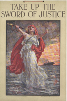 | ▲ "정의의 칼을 들어라!" 제1차 세계 대전의 선전전에서 루시타니아 호는 영국의 혁혁한 승리를 가져다줬다. 참극을 빚어낸 여러 요인 중 가장 두드러진 것이 독일 어뢰였기 때문에 다른 요인들의 검토를 철저히 틀어막는 것이 영국의 기본 전략이었다. 그 결과 사건의 많은 부분이 아직까지도 미궁에 빠진 채로 있고 영국인들의 수치감을 풀 길이 없다. 전쟁 중의 '상황 논리'가 이성을 마비시킨 데 대한 수치감이다. 전쟁 중이 아닌 사회에서도 이성이 그 못지않게 마비될 수 있다는 사실을 알면 영국인들에게 위로가 될까? ⓒ프레시안 |