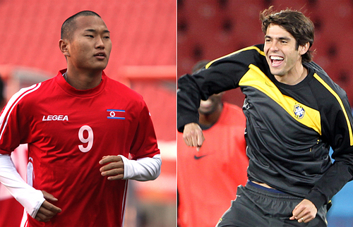 | ▲경기를 앞두고 훈련에 임하는 북한의 정대세와 브라질의 카카. 북한은 극단적 수비전략을 택할 수밖에 없다. 브라질은 자국민들의 원성을 살 정도로 수비력을 강화한 팀이다. 객관적으로는 북한의 창이 브라질의 방패를 뚫기도 쉽지 않다. 이번 월드컵의 화두는 '수비'다. ⓒ연합 |