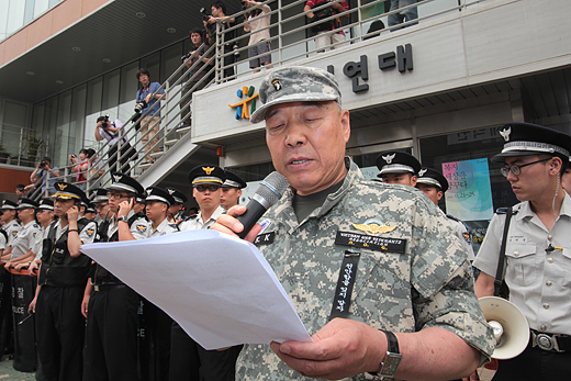 | ▲ 군복을 입고 시위 중인 고엽제 전우회 회원들. 경찰은 방호복으로 무장한 경비 병력을 투입했다. ⓒ프레시안(최형락) |